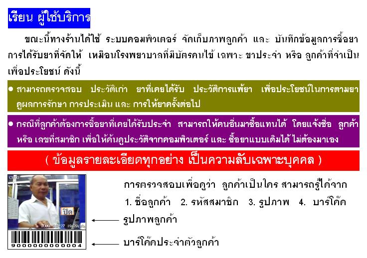การทำบัตรประจำตัวลูกค้า ทำไปสักพัก จะทำให้เราจำลูกค้าได้มากขึ้น เพราะมีภาพ ความสัมพันธ์ระหว่างเรากับลูกค้าก็มีมากขึ้น นอกจากนี้เก็บข้อมูลไปสักช่วงหนึ่ง 2 ? 3 เดือน เราไปดูสถิติจากโปรแกรมร้านยา เราก็จะดูได้ว่า ใครมาบ่อย มาถี่ ซื้อยามาก หรือ น้อย ใคร คือ ขาประจำตัวจริง