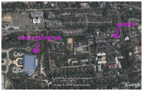 หอพักคณะเภสัชจาก google earth ครับ ทราบมาว่าเดี๋ยวนี้มีการสร้างหอเพิ่มเติมรู้สึกว่าจะเป็นที่เห็นอยู่ด้านหลังหอเก่านะครับ แยกเป็นหอชายและหญิง ปิดตำนาน "มนต์รักข้างบันได" ไปเรียบร้อยแล้ว :lol: