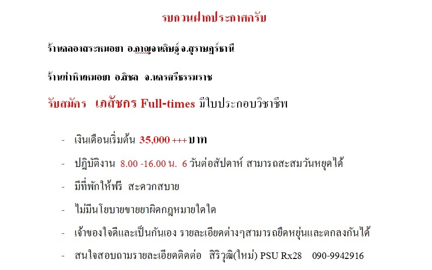 รับสมัครเภสัช ฟูลไทม์ ร้านคลองสระหมอยา อ กาญจนดิษฐ์ จ สุราษฏ