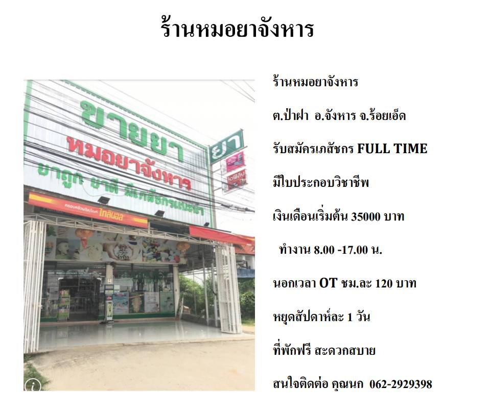 หมอยาจังหาร จ.ร้อยเอ็ด รับเภสัชกร 35000++