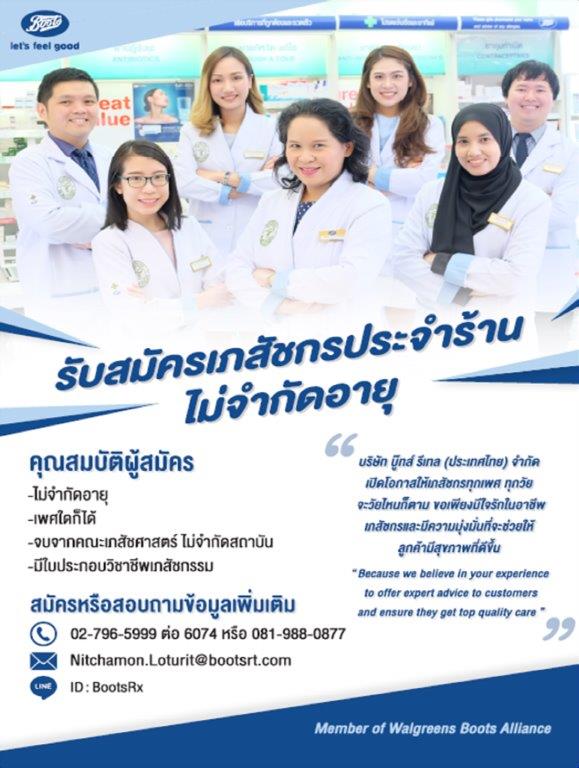 บริษัท บู๊ทส์ รีเทล (ประเทศไทย) จำกัด เปิดโอกาสให้เภสัชกรทุกเพศ ทุกวัย จะวัยไหนก็ตาม ขอเพียงมีใจรักในอาชีพเภสัชกรและมีความมุ่งมั่นที่จะช่วยให้ลูกค้ามีสุขภาพที่ดีขึ้น