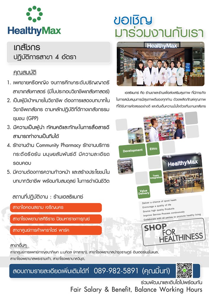 จึงอยากจะขอเชิญชวนพี่น้องเภสัชกรที่สนใจมาร่วมงาน โดยไม่จำกัดอายุ สถาบัน และยินดีต้อนรับน้องเภสัชจบใหม่ รวมถึงสายงานโรงพยาบาลหรือโรงงาน เพื่อแสดงบทบาทแห่งวิชาชีพเภสัชกร พร้อมร่วมพัฒนาและเติบโตไปด้วยกันกับ HealthyMax ค่ะ