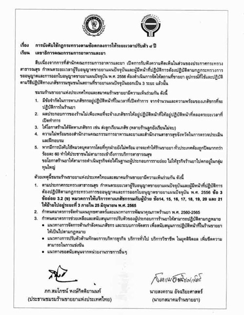 ด้วยเหตุนี้ชมรมร้านขายยาแห่งประเทศไทย และสมาคมร้านขายยา มีความเห็นร่วมกัน ดังนี้ 1. ข้อปฏิบัติที่ต้องทำในระยะที่ 1 ตามกฎกระทรวงฯ ข้อ 3 ข้อย่อย 3.2 (ข) หมวดการให้บริการทางเภสัชกรรมกับผู้ป่วย ข้อ 14 15 16 17 18 19 20 และ 21 ให้ย้ายไปอยู่ในระยะที่ 3 ภายใน 25 มิถุนายน 2565 2. กำหนดมาตรการจัดทำแผนยุทธศาสตร์และแนวทางการพัฒนาคุณภาพร้านยา พ.ศ. 2560 - 2565 และ 3. กำหนดมาตรการช่วยเหลือและสนับสนุนการปรับตัวของผู้ประกอบการร้านยาให้สามารถปฏิบัติตามกฎหมาย เช่น มีแนวทางการจัดการด้านกำลังคนเภสัชกรและระบบการจัดสรรเพื่อสนับสนุนการปฏิบัติหน้าที่ในร้านขายยาให้เป็นไปตามกฏหมาย มีแนวทางการปรับตัวด้านทักษะการบริหารธุรกิจ บริการทั่วไป บริการวิชาชีพในยุคดิจิตอล เพิ่มขีดความสามารถในการแข่งขัน และมีแนวทางของสนับสนุนจากหน่วยงายราชการอื่น ๆ