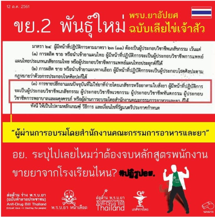 -ให้ยกเลิกกฎข้อบังคับที่ให้มีการตรวจสอบความรู้และสั่งพักใช้Pharmacy License หากการตรวจสอบไม่ผ่านหรือไม่เข้ารับการตรวจสอบความรู้