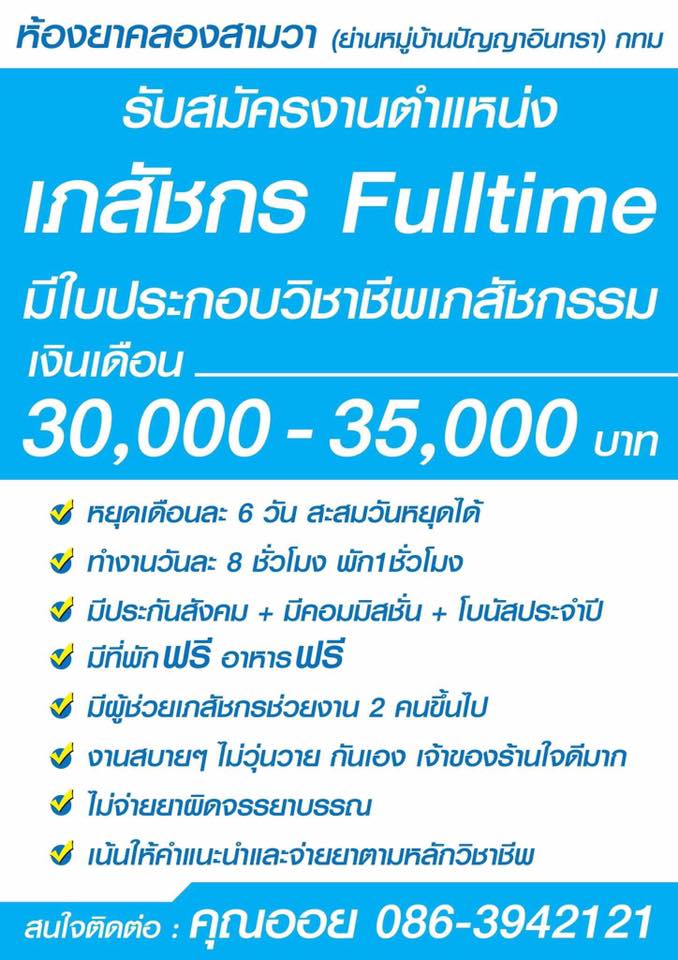 Re: ร้านยาคลองสามว่า รับสมัครF/Tร้านยา 1 ตำแหน่ง