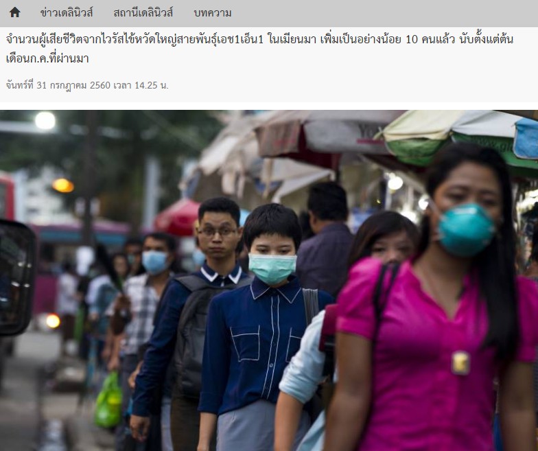 จำนวนผู้เสียชีวิตจากไวรัสไข้หวัดใหญ่สายพันธุ์เอช1เอ็น1 ในเมียนมา เพิ่มเป็นอย่างน้อย 10 คนแล้ว นับตั้งแต่ต้นเดือนก.ค.