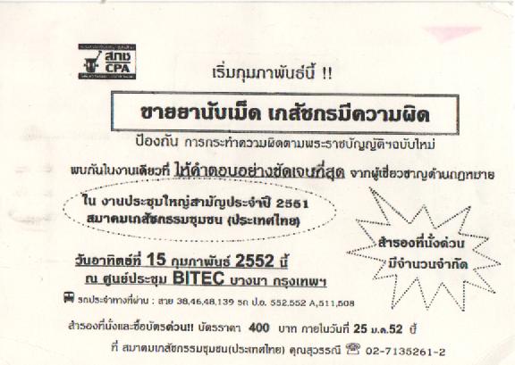 เข้าใจว่า คงกำหนดหัวข้อเพื่อให้เกิดความตื่นเต้นตามหลักการตลาดมากกว่าครับ หัวข้อจริง คือ "พลิกวิกฤตให้เป็นโอกาสกับกฎหมายคุ้มครองผู้บริโภค" โดย ท่านผู้พิพากษา ชาญณรงค์ ปราณีจิตต์ ประธานศาลอุทธรณ์ , ภก.รศ.ดร.วิทยา กุลสมบูรณ์ ผู้จัดการแผนงาน คคส.คณะเภสัชศาสตร์ จุฬาฯ และ ภก.อภิชาต อรุณไพโรจน์ เภสัชกรดีเด่น สาขาเภสัชกรรมชุมชน อภิปรายวันที่ 15 กพ. 52 เวลา 09.30-11.00 น. ณ ศูนย์ฯ ไบเทค บางนา