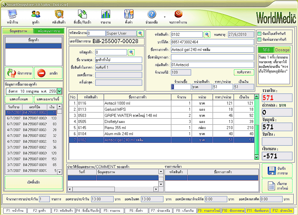 - ฟังก์ชั่นการทำงานทุกอย่างประสานและสอดคล้องกัน ในด้านจำนวน ราคาขาย และส่วนลด และ รวมเงิน ตลอดจนนำชื่อยาลงบันทึกในรายการ ซึ่งผู้ใช้จะเห็นภาพและเข้าใจได้ง่ายมาก