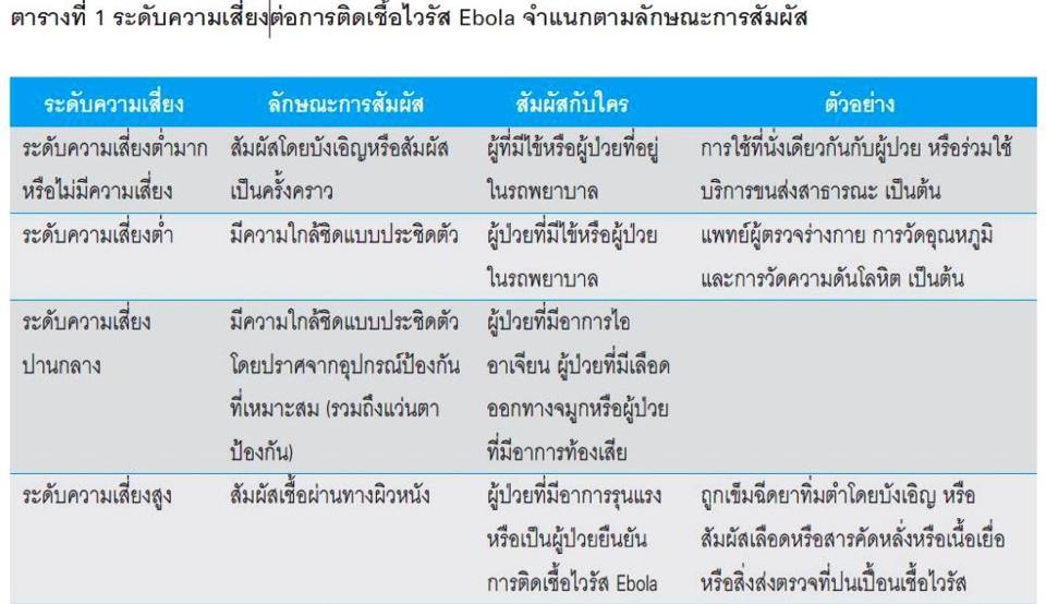 ตารางบ่งบอกระดับความเสี่ยงของการติดเชื้อไวรัส Ebola จากเอกสารสำนักระบาด กรมควบคุมโรค กระทรวงสาธารณสุข