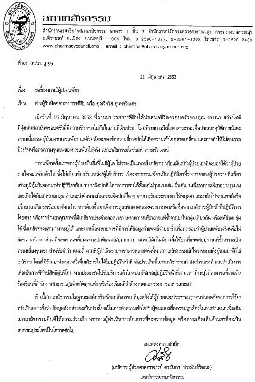 Re: สภาเภสัชกรรมทำหนังสือชี้แจงรายการตี10 กรณีแพ้ยา