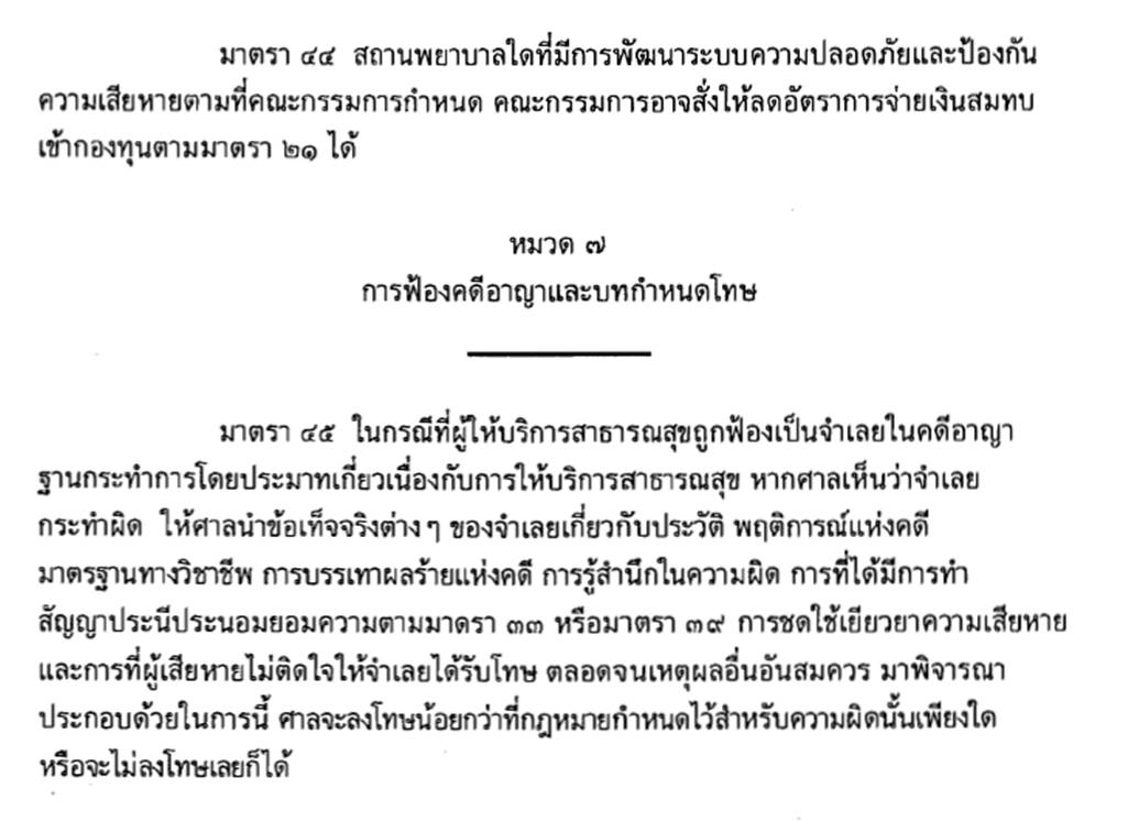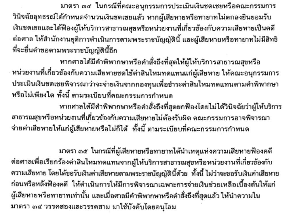 ตัวอย่างคดีดังกล่าว และ มาตรา 33 , 34 ,45 จึงเป็นหลักประกันที่ช่วยเสริมเจตนารมย์ของกฎหมายฉบับนี้ ที่จะลดการฟ้องร้อง ลดความขัดแย้งระหว่างคนไข้กับผู้ให้บริการ