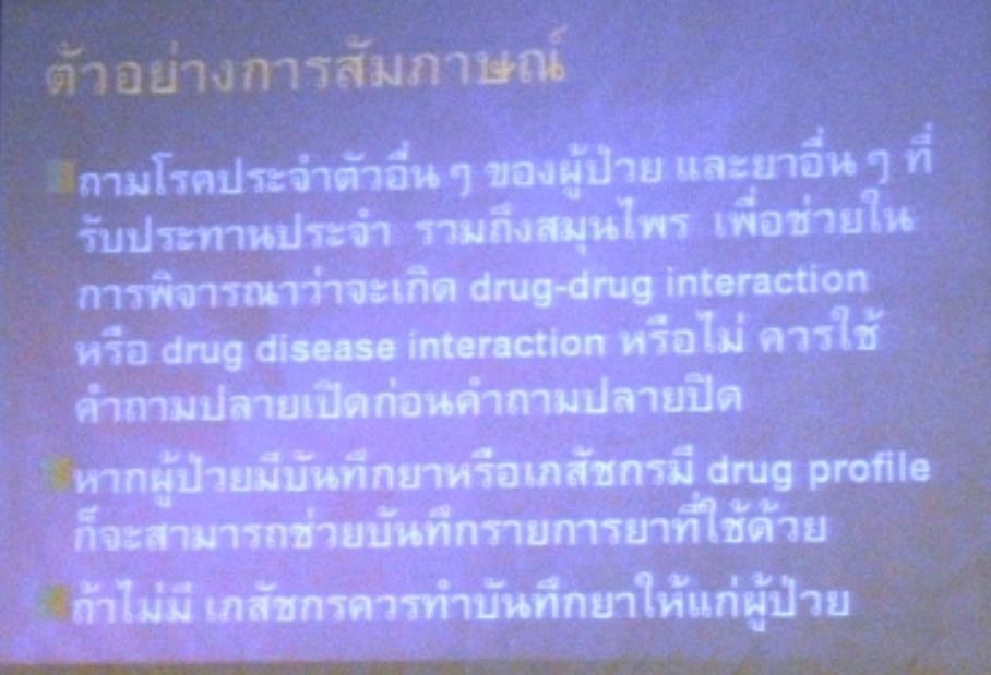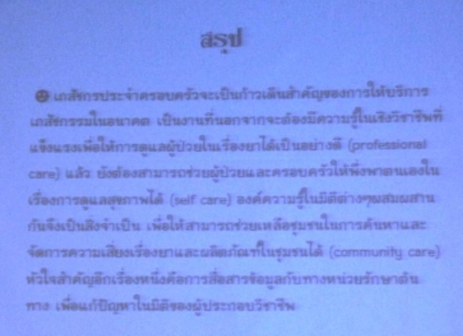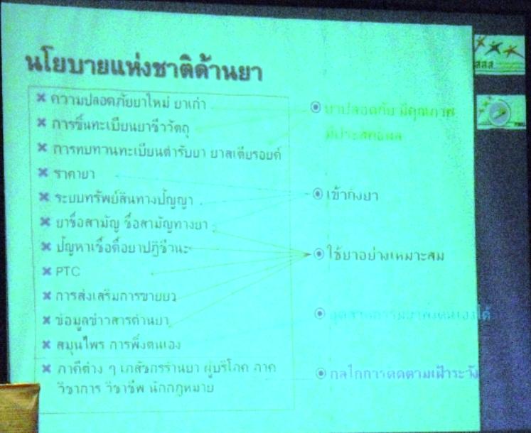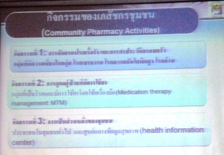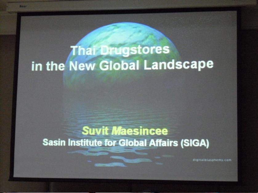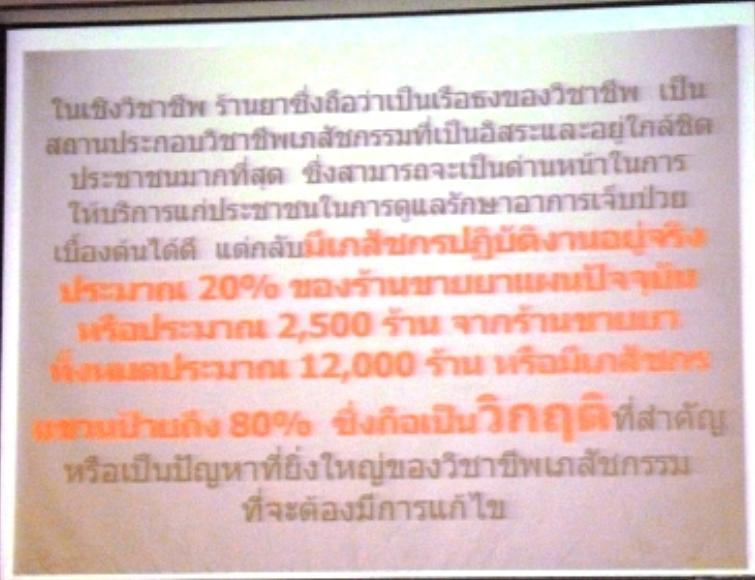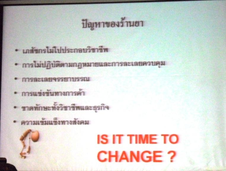 เนื้อหาที่บรรยาย วิทยากร ดึงมาจากงานวิจัยที่เคยทำ ทั้งจากต่างประเทศ และไทย ฟังแล้วก็ได้ข้อคิดเพิ่มเติม พร้อมทั้งฉายวิดีโอของร้านยาสมัยใหม่ในต่างประเทศให้ชม