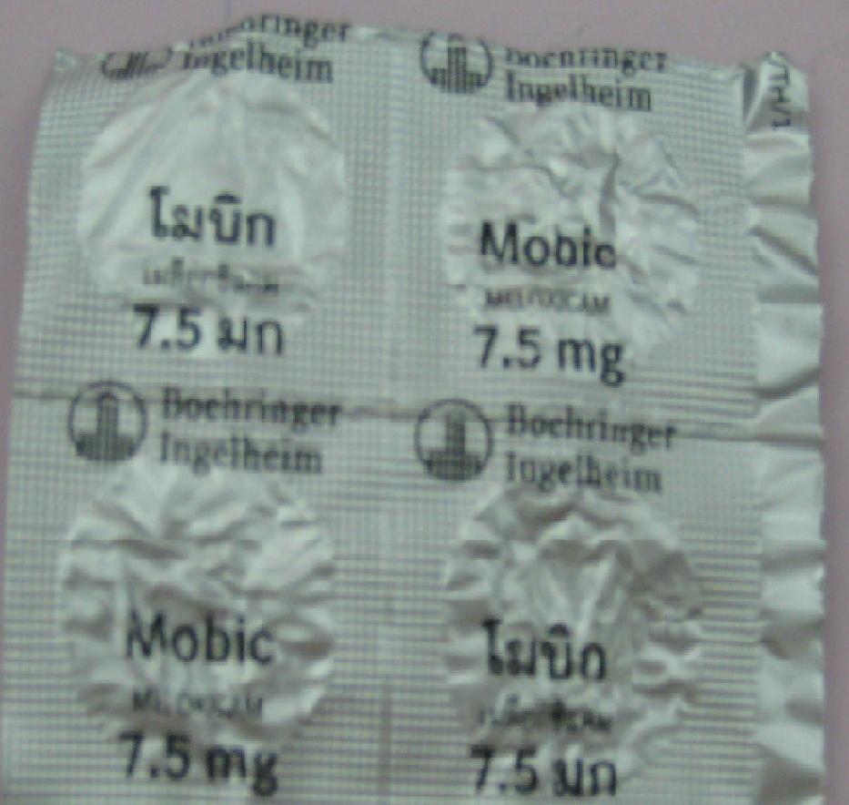 ได้ไปซื้อ Mobic 7.5 mg มาจากยี่ปั้ว แล้วมาขายให้ลูกค้า อีกหลายวันต่อมาลูกค้ามาบอกว่าแผงยามียาแค่ 9 เม็ด จึงบอกให้ลูกค้าเอาแผงมาให้ดู ก็พบว่าที่ฟอล์ยมุมขวาบน (ตามรูป) ไม่มีเม็ดยา ส่วนอีก 9 เม็ดนั้นลูกค้าได้ฉีกฟอล์ยรับประทานไปหมดแล้ว จึงได้โทรไปบอกทางบริษัท Boehringer และจะให้ผู้แทนติดต่อมา