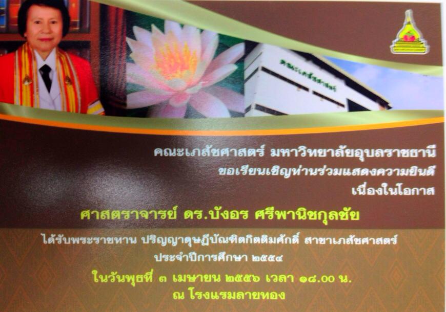 ขอเชิญศิษย์เก่าคณะเภสัชศาสตร์ มหาวิทยาลัยอุบลราชธานี ร่วมแสดงควมยินดีเนื่องในโอกาส ศาสตราจารย์ ดร.บังอร ศรีพานิชกุลชัย คณบดีคณะเภสัชฯ ม.อบ คนแรก ได้รับพระราชทานปริญญาดุษฎีบัณฑิตกิตติมศักดิ์ สาขาเภสัชศาสตร์ ในวันที 3 เมษายน 2556 ณ โรงแรมลายทอง จ อุบล สามารถแจ้งชื่อได้เลยนะครับ (อ. ศักดิสิทธิ์ ศรีภา ขอความร่วมมือประชาสัมพันธ์ศิษย์เก่าเข้าร่วม และอยากให้มากันเยอะๆ ) เพื่อแสดงความกตัญญูต่อคณบดีคนแรกของเราครับ