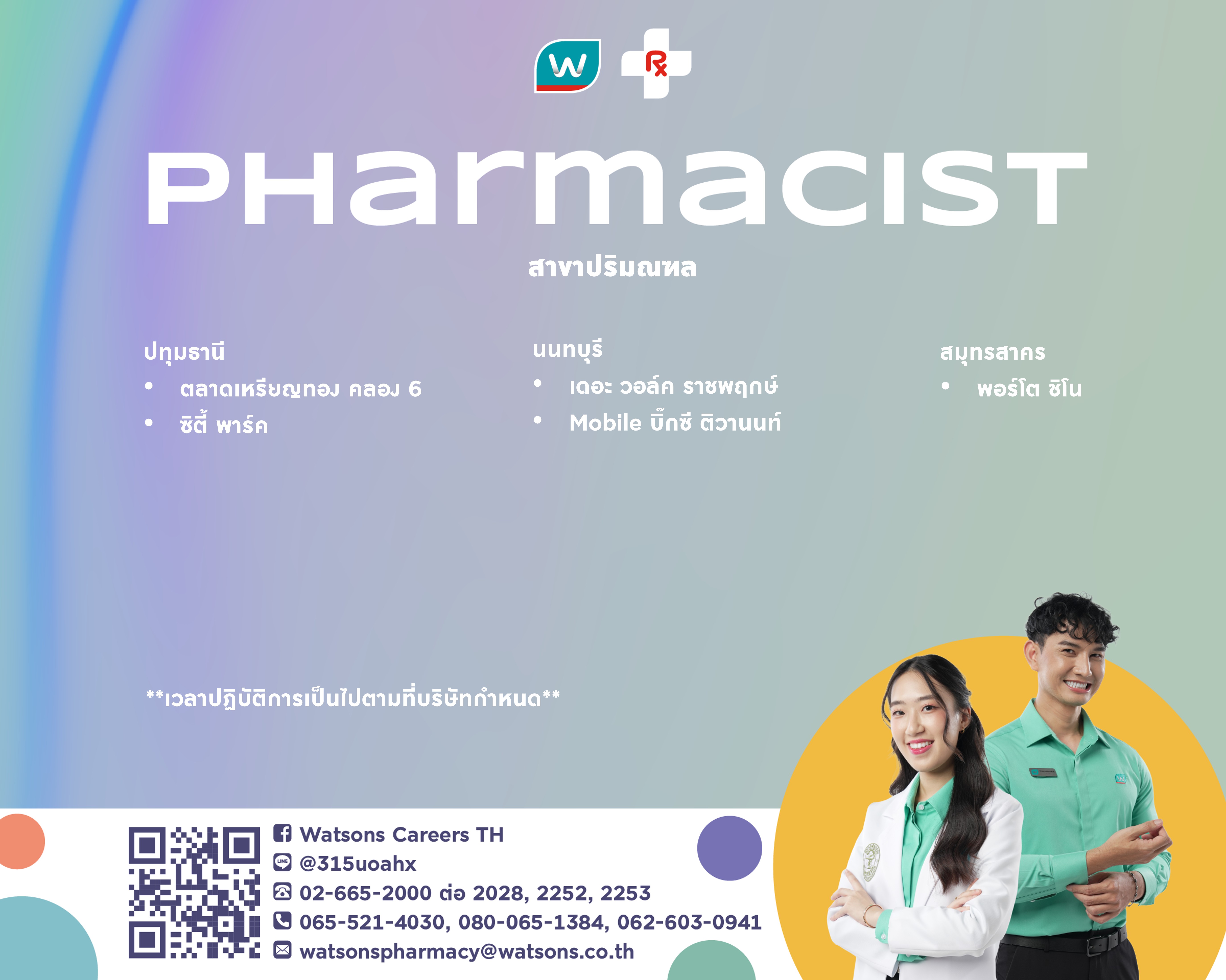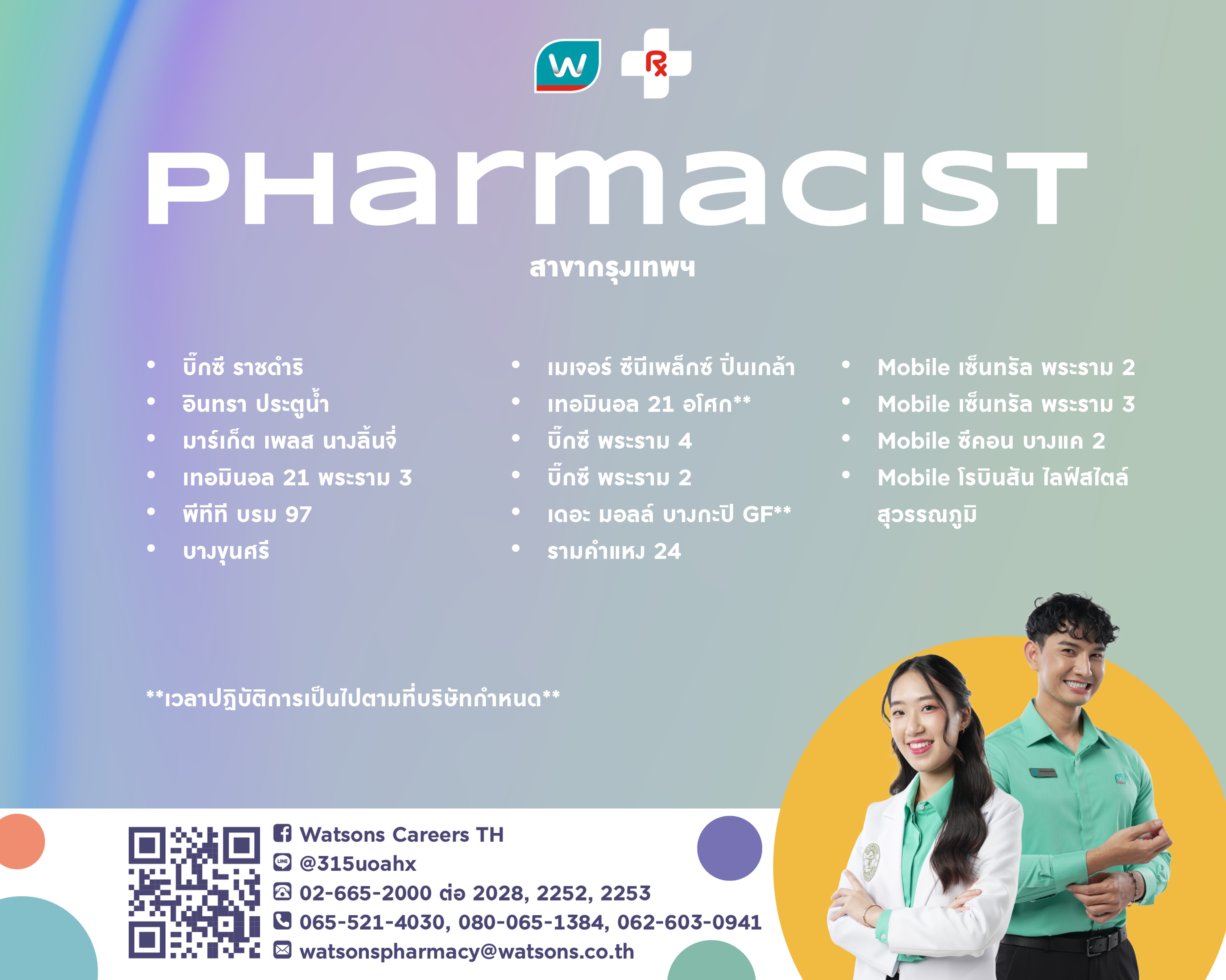 WatsonsPharmacyThailandMobile: 065-521-4030, 080-065-1384, 062-603-0941 Tel: 02-665-2000 ext.2252, 2028, 2253 E-mail: watsonspharmacy@watsons.co.th Line ID: @315uoahx