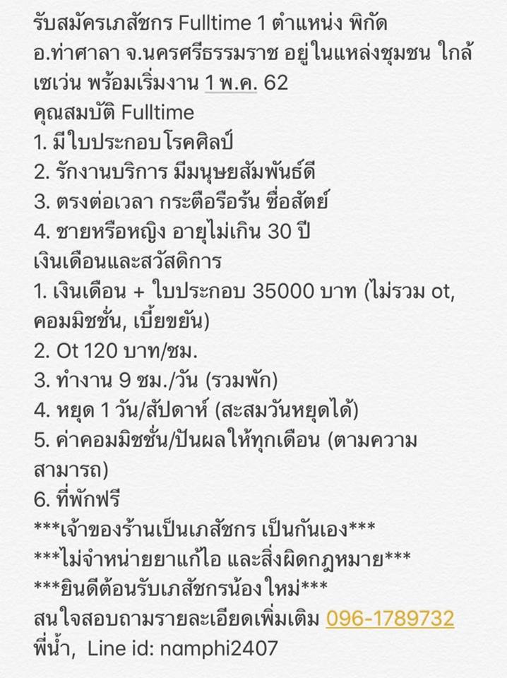 ด่วน!!! รับสมัครเภสัชกร F/T 1 ตำแหน่ง พิกัด อ.ท่าศาลา จ.นครศรีธรรมราช อยู่ในแหล่งชุมชน ใกล้เซเว่น พร้อมเริ่มงาน 1 พ.ค. 62