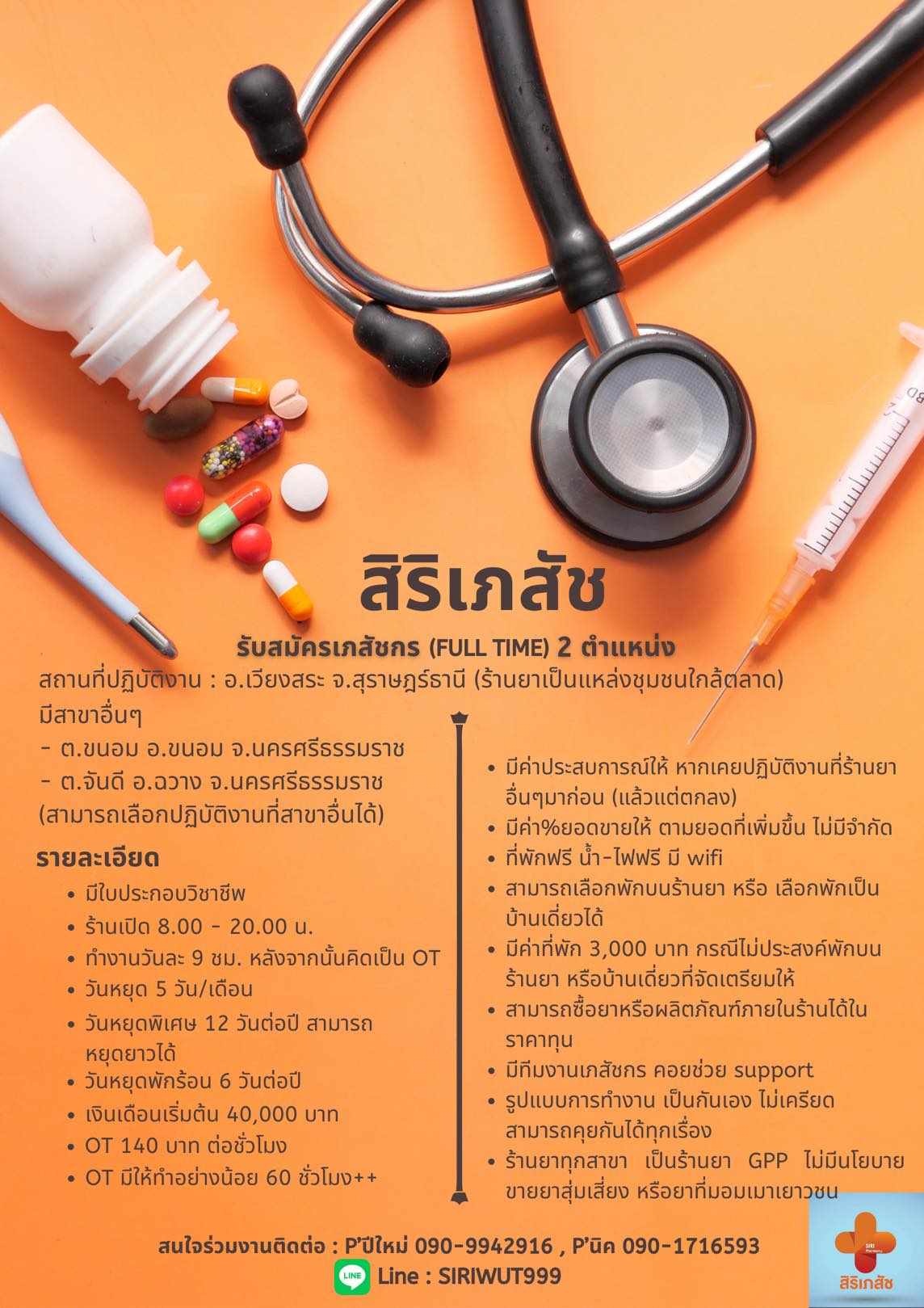 สิริเภสัชรับเภสัชFTจ.สุราษฎร์ธานี40-60kที่พักฟรีมี%ยอด+โบนัส