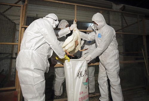 เจ้าหน้าที่สาธารณสุขจีนจับห่านลงกระสอบเพื่อนำไปสังหารตามมาตรการป้องกันการแพร่ระบาดของเชื้อไวรัสไข้หวัดนก เอช7เอ็น9 (H7N9) ในมณฑลเจ้อเจียง (ภาพ - รอยเตอร์ส)