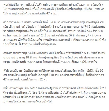 นอกจากนี้ยังพบผู้ป่วยในจอร์แดน กาตาร์ ตูนิเซีย สหรัฐอาหรับเอมิเรตส์ ฝรั่งเศส และอังกฤษ.-สำนักข่าวไทย
