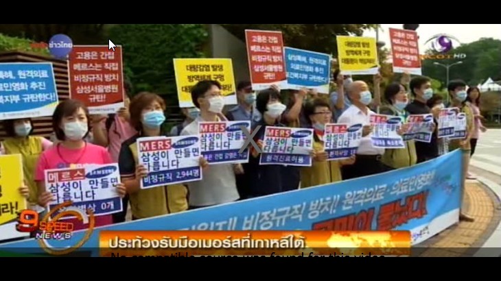 เกาหลีใต้ 19 มิ.ย.-บุคลากรสาธารณสุขเกาหลีใต้ประท้วงศูนย์การแพทย์ซัมซุง เหตุล้มเหลวในการป้องกันการแพร่ระบาดของไวรัสเมอร์ส ส่งผลมีผู้ติดเชื้อจากศูนย์การแพทย์แห่งนี้หลายสิบคน