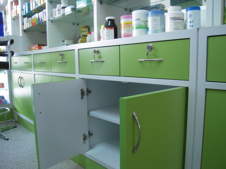 1.ตู้ติดผนัง สูง 2.4 เมตร กว้าง 5.6 เมตร (ตู้เจ็ดตัวสามารถแยกได้) ความลึกของชั้นวางยา 30 เซนติเมตร โดยประมาณ ด้านล่างของตู้มีลิ้นชักและตู้มีประตูบานเปิดเก็บสต็อกยาตามรูป ตู้ด้านหลังเป็นกระจก ชั้นวางยาเป็นกระจกสามารถปรับระดับได้ มีกระจกและหมุดรองกระจกสำรองให้