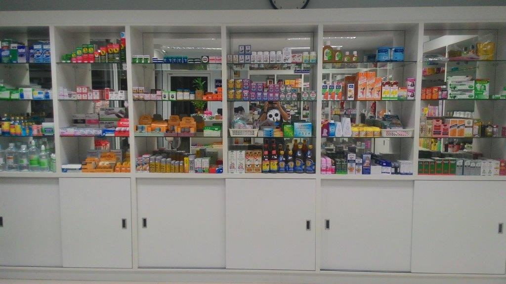 1. ตู้ยาเรียงรอบร้านเป็น U-Shape และเคาน์เตอร์เก็บยาอันตราย ทั้งหมดกรุกระจกเงา และชั้นเป็นกระจกใส