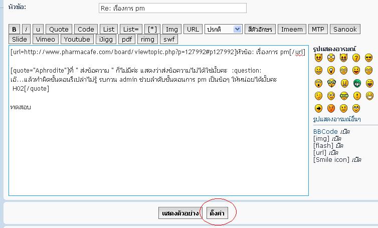 เห็นปุ่ม pm แล้วค่ะ คลิ๊กเข้าไปและพอพิมพ์ข้อความแล้วต้องการส่ง มันส่งไม่ได้น่ะค่ะ :question: