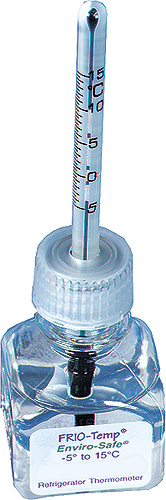 Refrigerator Bottle Thermometer ? Plastic bottle contains a glass thermometer submerged in white oil and citrus oil fluid that insulates and protects it from temperature change each time the refrigerator is opened. ? Tip of thermometer is submerged into the fluid so the temperature of the fluid is being measured and not the air.
